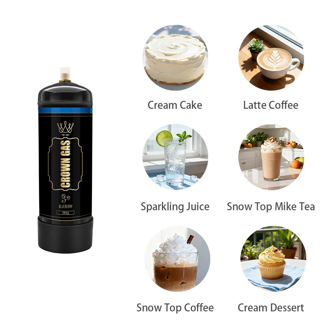 Create delicious treats with the Crown Gas Blueberry Flavor Cream Can (380g). High-quality stainless steel charger containing food-grade nitrous oxide for smooth, blueberry-scented whipped cream.