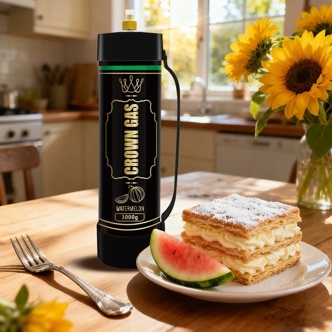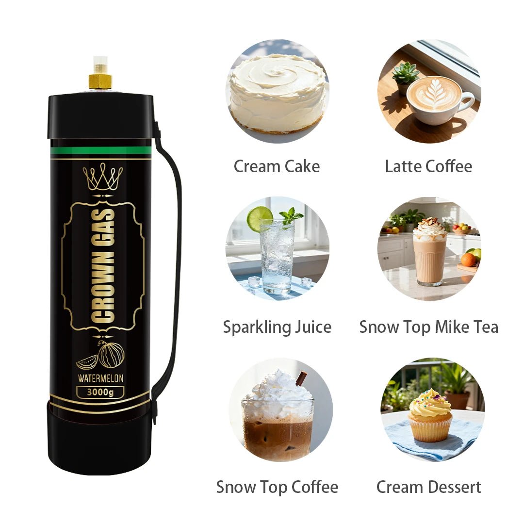 Maximize efficiency with the massive Crown Gas Watermelon Flavor Cream Can (3000g). Commercial-grade stainless steel tank filled with food-grade nitrous oxide for watermelon-scented whipped cream on a large scale.